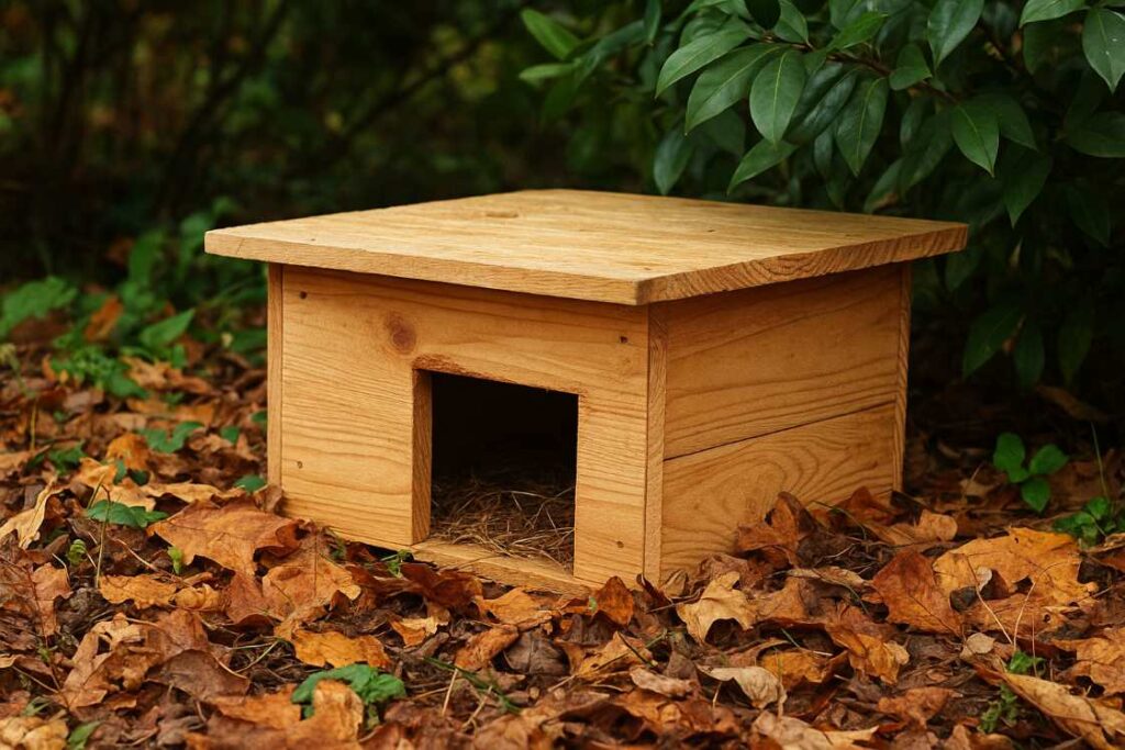 Postaw domek w spokojnym miejscu – pod krzewem, przy płocie, w kącie ogrodu. Wejście skieruj na południe lub wschód, osłoń je od wiatru i deszczu. Możesz przykryć całość gałęziami lub liśćmi – wygląda naturalnie i zapewni lepszą izolację.